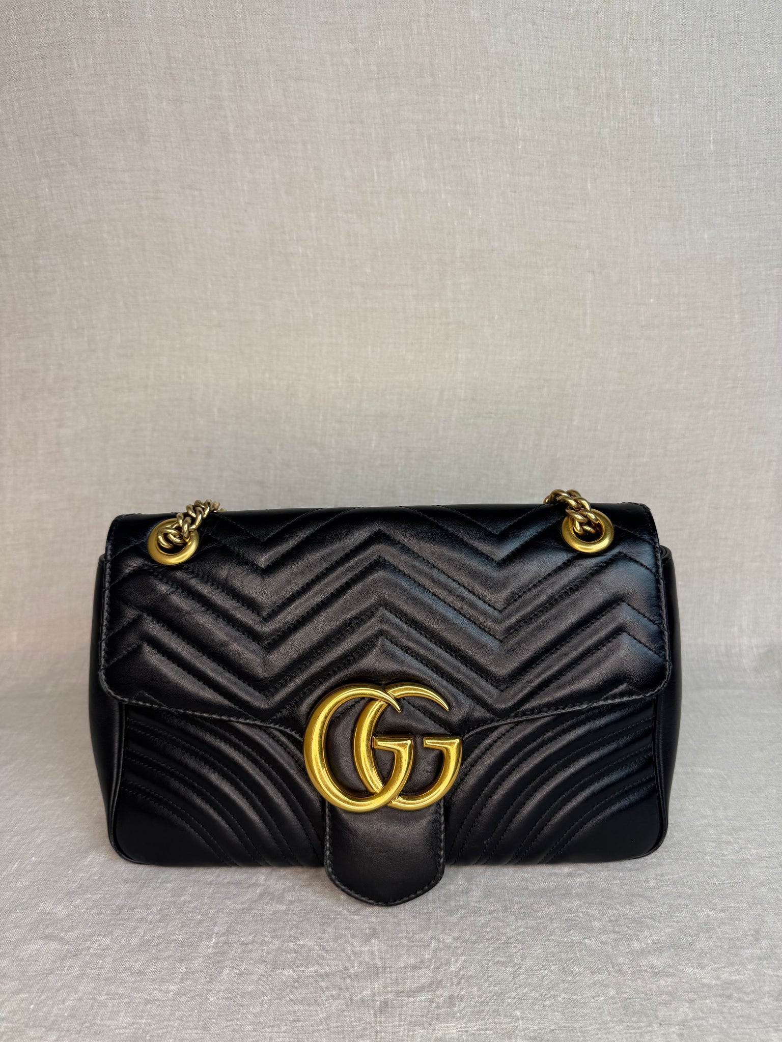 The Gucci GG Marmont is an essential for daily carry. Crafted from quilted black leather in Italy, this iconic piece features the signature GG plaque and a microfiber-lined interior with practical pockets. The adjustable chain strap transitions effortlessly from shoulder to cross-body wear, making it versatile for any occasion. Perfect for those who prefer to travel light with just the necessities.